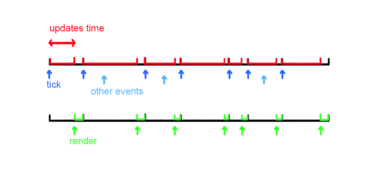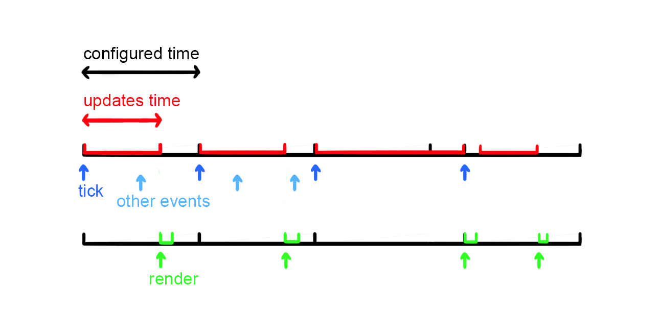 In Messenger, rendering does not correspond directly to a single game update. Instead, an event queue is maintained, where each event triggers a game update. After all events in the current queue are processed, rendering occurs. While the game is updating and rendering, any new incoming events are added to a new queue, which will be handled in the next cycle, rather than being added to the current queue. The Tick event is treated like any other event, except that it is triggered repeatedly.