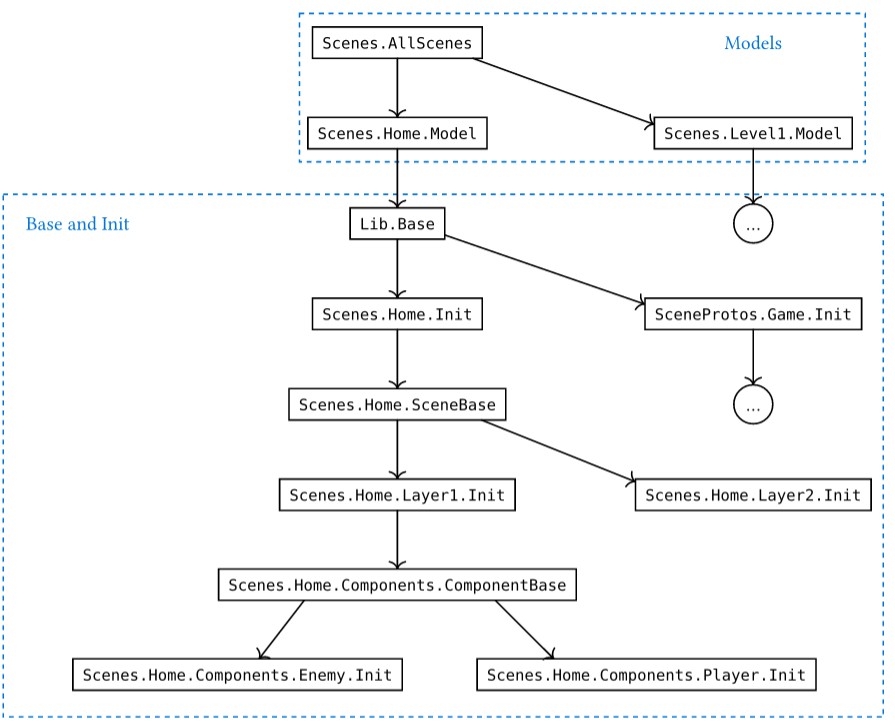 However, in the "Base and Init" zone, you should carefully handle the dependency. The rule is: upper level may depend on lower levels. Never use Lib.Base in any Base or Init. If necessary, use a type parameter and instantiate it in models (see the Scene Prototype Example).